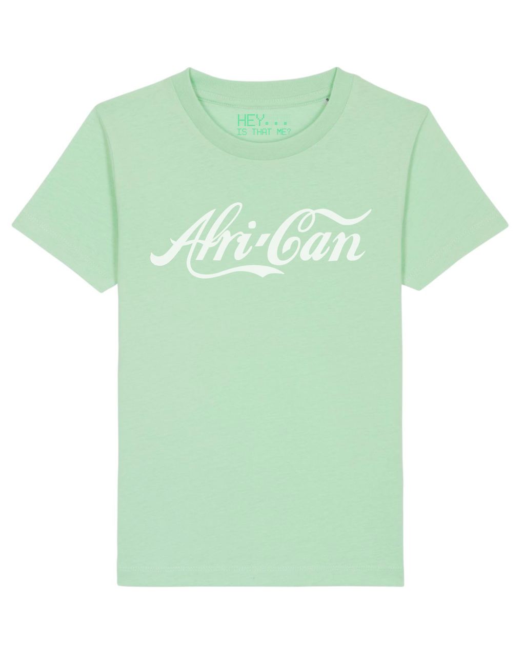 A sample organic cotton T-shirt featuring "Afri-Can" stylised slogan digitally printed on the front.
