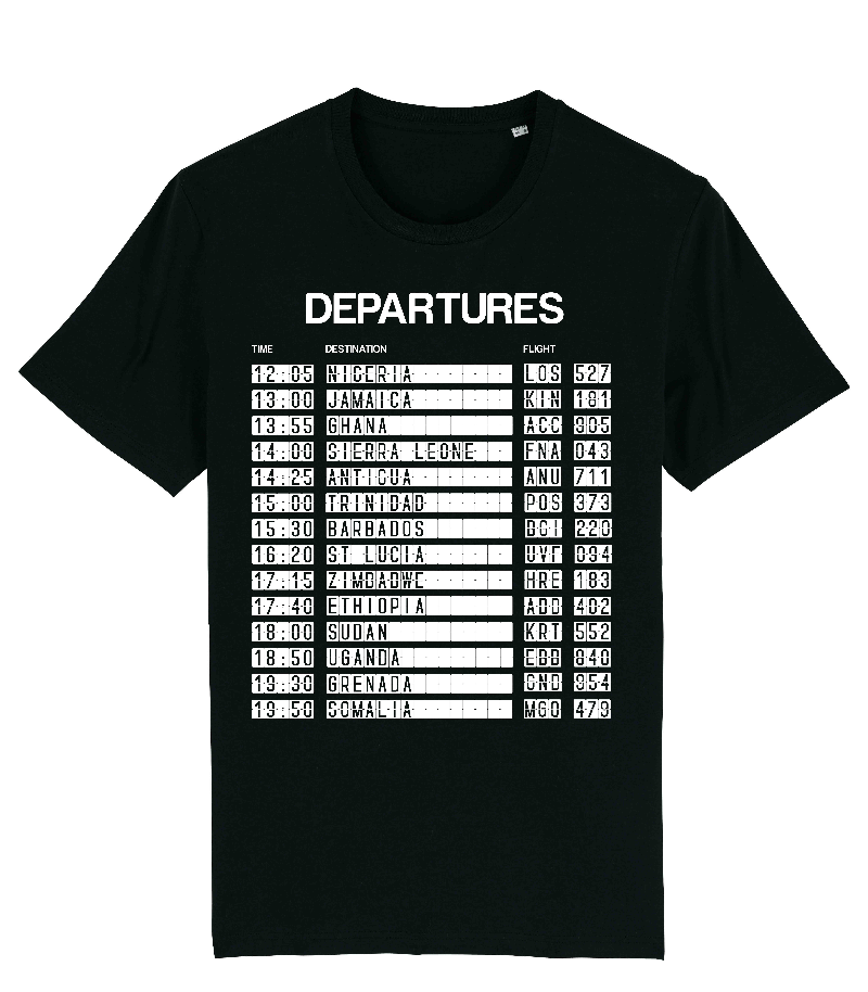 The ever-popular, organic cotton, unisex "Departures - 15 Nations" tee features flight details for 15 flights out of the diaspora, set on an old-school airport departure board. Don't be late!